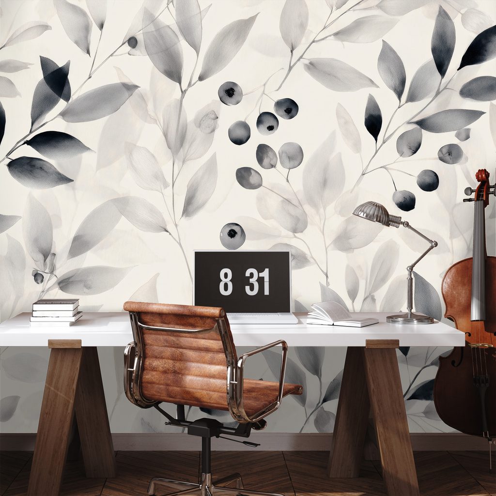 Tapéta fekete-fehér akvarell levelek és bogyók